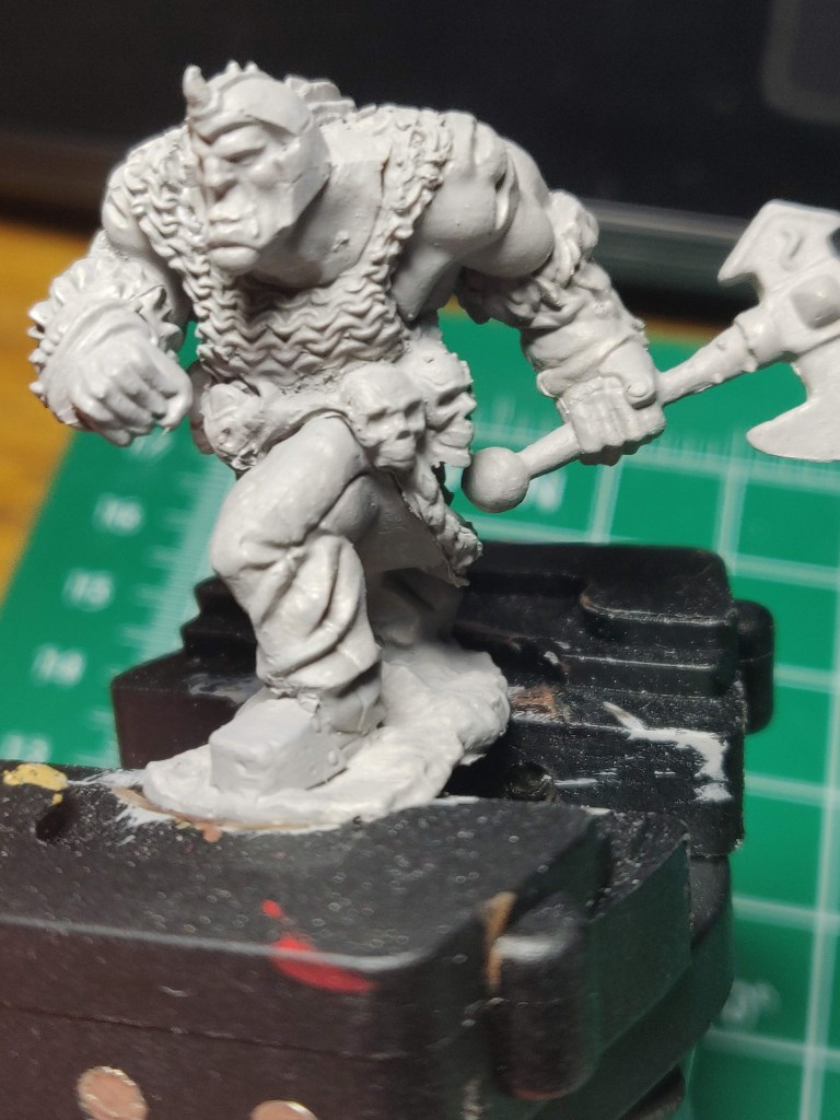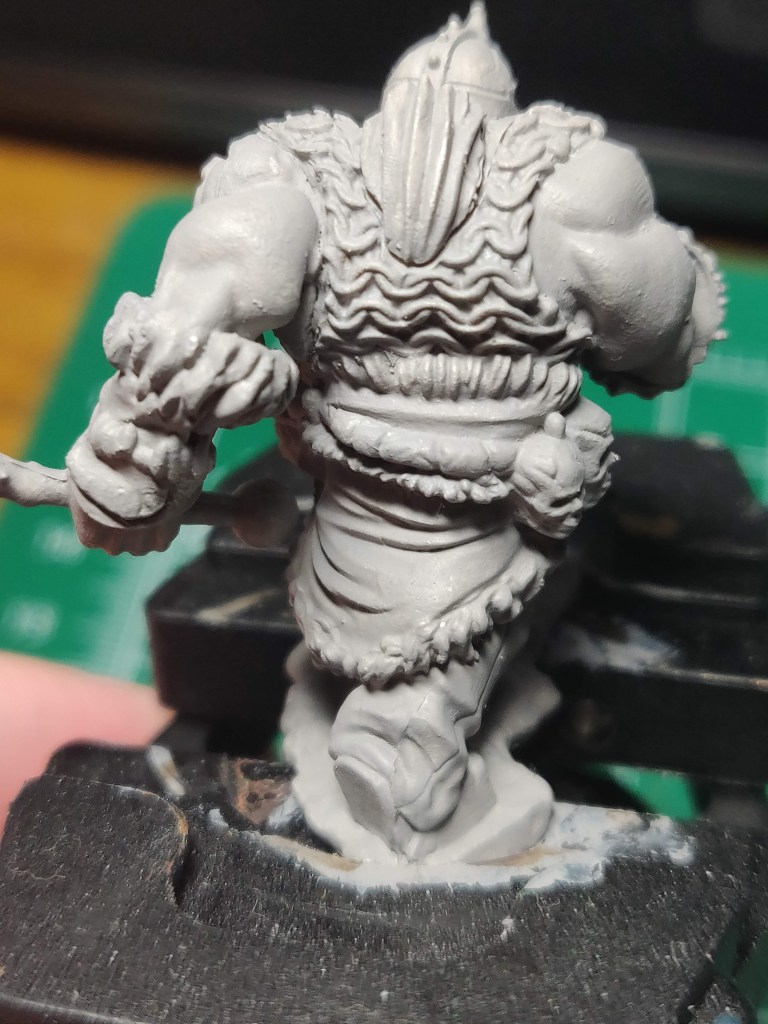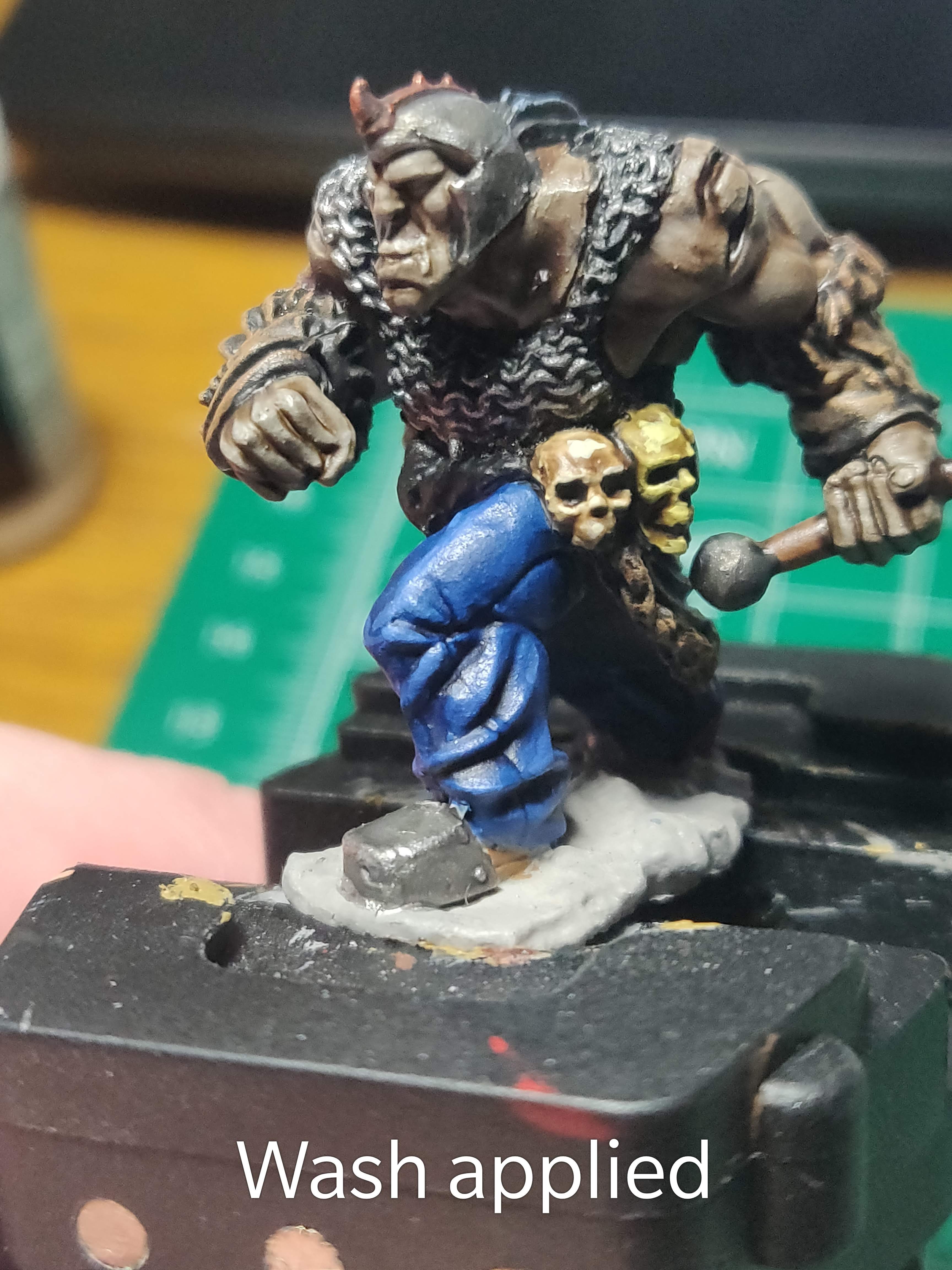 At this point you can finish putting the basecoats on your figure like you did for Nienna and this guy’s buddy. I like grey orcs, so I’ve left the primer coat again. The large flat areas of metal will look best with a wash, like the other orc’s armor plates.